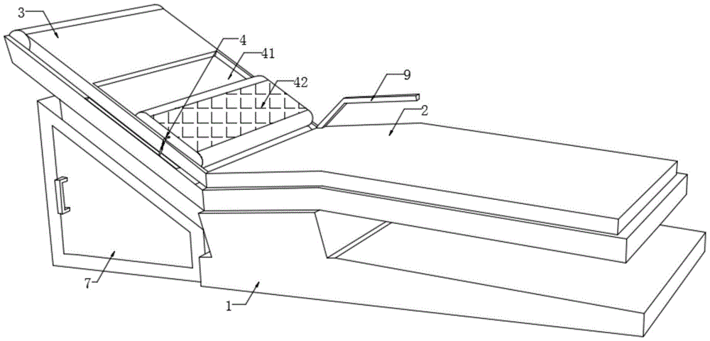 Preferably, the disinfecting assembly 5 comprises an air-draft type heat-radiating fan 52, a heating pipe 53, three ultraviolet lamp tubes 54, three instrument placing grooves 55 and six elastic clamping pieces 56, the air-draft type heat-radiating fan 52 is fixedly arranged on the back of the box door 7, the heating pipe 53 is fixedly arranged on one side inside the disinfecting box 51, the three ultraviolet lamp tubes 54 are fixedly arranged on the top end inside the disinfecting box 51 at equal intervals, the three instrument placing grooves 55 are arranged at the bottom end inside the disinfecting box 51 at equal intervals, the elastic clamping pieces 56 are fixedly arranged on two sides inside the three instrument placing grooves 55, a plurality of heat-radiating holes 8 are formed in the back of the disinfecting box 51, the gas inside the disinfecting box 51 is disinfected through the three ultraviolet lamp tubes 54, and the heat emitted by the heating pipe 53 disinfects the medical instruments in the three instrument placing grooves 55, so that the virus disinfection efficiency on the surface of the medical instruments is improved; the top end of one side of the sterilizing box 51 is fixedly provided with the temperature controller 6, a detection probe of the temperature controller 6 is fixedly arranged inside the sterilizing box 51, the air-draft type heat dissipation fan 52 is electrically connected with a power supply through the temperature controller 6, the air-draft type heat dissipation fan 52 is controlled to dissipate heat inside the sterilizing box 51 through the temperature controller 6, the medical staff is prevented from being scalded by heat generated after virus in the sterilizing box 51 is killed, and the medical staff can conveniently take and place medical instruments; an active carbon layer is fixedly arranged inside each of the heat dissipation holes 8, so that peculiar smell generated in the virus killing process is prevented from overflowing the inside of the disinfection box 51; one side of the top end of the cushion 2 is fixedly provided with an armrest 9, and the armrest 9 can save more labor when a patient uses the treatment chair; the surface of the waist cushion 42 is fixedly provided with a plurality of massage bumps, which is convenient for massaging the waist of the patient, and prevents the comfort of the patient from being reduced due to too long medical treatment time; the middle part of one side of the sterilizing box 51 is fixedly provided with a switch panel 11, the surface of the switch panel 11 is respectively provided with a heating tube switch and an ultraviolet lamp tube switch, the heating tube 53 and the three ultraviolet lamp tubes 54 are respectively electrically connected with a power supply through the heating tube switch and the ultraviolet lamp tube switch, and the heating tube 53 and the three ultraviolet lamp tubes 54 can be controlled by a worker conveniently.