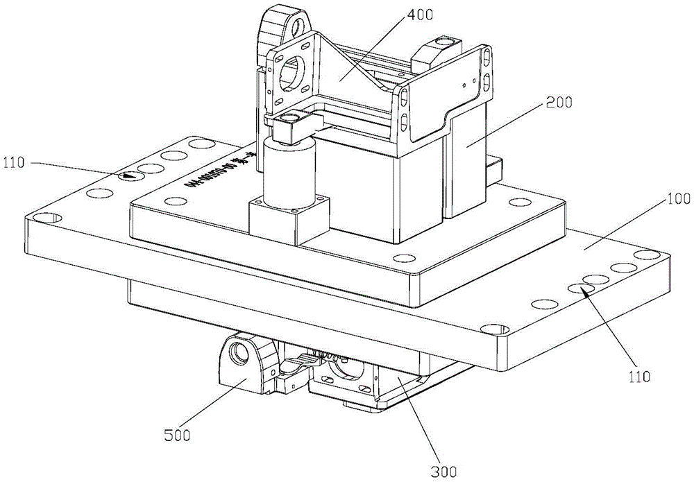 a second process fixing base 320, wherein the second process fixing base 320 is fixedly arranged on the second connecting base 310 and is used for placing the workpiece B500;