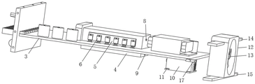 Wherein as shown in fig. 2 and fig. 3, the through-hole with 4 looks adaptations of heat dissipation case is seted up at the middle part of circuit board 3, circuit board 3's right side, the front and the back respectively with shell 1's right side inner wall, the space is left to front inner wall and back inner wall, and the equal fixedly connected with journal stirrup 17 in the front and the back of circuit board 3 right-hand member, circuit board 3's right-hand member is respectively through two journal stirrups 17 and shell 1's front inner wall and back inner wall fixed connection, the space that leaves can make circuit board 3 upper portion and the hot-air of lower part obtain the circulation, the heat dissipation cycle efficiency is improved, the firmness of circuit board 3 can be improved to journal stirrup 17.