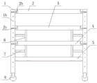 The using method comprises the following steps of firstly, placing two first support rods 1 at the installation position of a precast beam, fixing the two first support rods by stepping down a brake plate of a second roller 8, adjusting the height of the first support rods 1 to enable the first support rods to be arranged at the position which is 50cm right below the installation position of the precast beam, then sequentially installing a fourth connecting rod 5, a third connecting rod 4, a second connecting rod 3 and a first connecting rod 2 at the interval position of the two first support rods 1, conveniently adjusting the installation position through a first roller 2a, and fixing the relative positions of the connecting rods and the first support rods 1 through a fixing plate 2 b.