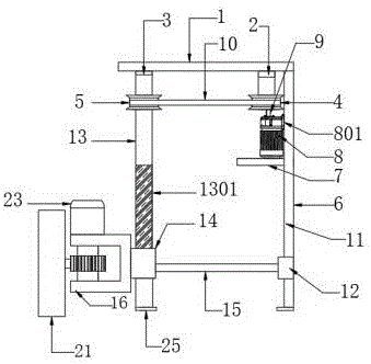 Embodiment 6, as shown in fig. 1 on the basis of embodiment 1, one side of the motor 8 is fixedly provided with a motor frame 801, and the motor frame 801 is fixedly connected with the side plate 6 through bolts, so that the motor 8 can be better fixed, and potential safety hazards caused by the motor 8 in the working process are prevented.