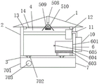 1. The utility model provides a livestock breeding delivery room, includes roof (1), its characterized in that: the solar energy water heating and water saving house is characterized in that walls (2) are fixedly connected to the periphery of the bottom of the house top (1), fluorescent lamps (4) are fixedly connected to the top of the left side of the inner wall of the wall (2), the fluorescent lamps (4) are located at the bottom of the house top (1), a floor (3) is fixedly connected to the bottom of the wall (2), a cleaning device (5) is arranged on the left side of the wall (2), the cleaning device (5) comprises a solar energy water heating tank (501) and a cleaning box (502) which are arranged outside a producing house, water outlets of the solar energy water heating tank (501) and the cleaning box (502) are respectively communicated with a first water pump (505) and a second water pump (506), an electric telescopic rod (508) is fixedly connected to the top of the inner wall of the house top (1), a shower head (509) and a water baffle (510) are fixedly connected to the bottom of the electric telescopic rod (508), and the water baffle (510) is located at the top of the shower head (509), the top intercommunication of gondola water faucet (509) has flexible pipe of ripple (507), the flexible one end intercommunication that keeps away from gondola water faucet (509) of ripple (507) has water pipe (503), the one end that flexible pipe of ripple (507) was kept away from in water pipe (503) is communicated with the delivery port of first water pump (505) and second water pump (506).