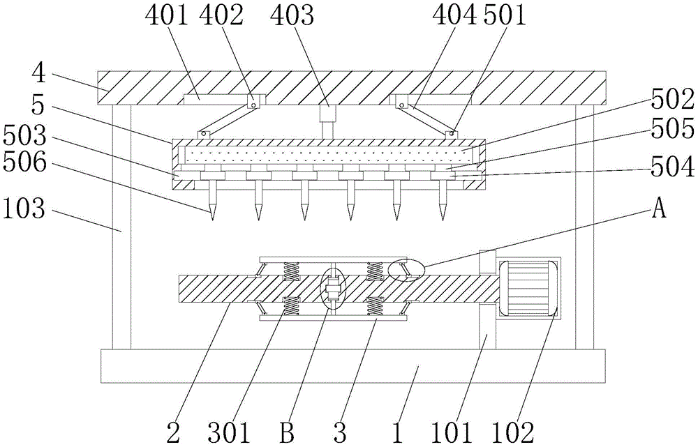 Referring to fig. 1 to 4, the present invention provides a technical solution: a slitting machine for processing adhesive tapes comprises a base 1 and a limiting plate 3, wherein a supporting plate 101 is fixedly arranged on the upper surface of the base 1, a supporting rod 103 is fixedly arranged on the upper surface of the base 1, a motor 102 is fixedly arranged on the side surface of the supporting plate 101, a rotating roller 2 is rotatably connected to one side of the supporting plate 101, a first sliding groove 201 is formed in the outer side surface of the rotating roller 2, a first sliding block 202 is slidably connected to the inner side of the first sliding groove 201, the output end of the motor 102 is fixedly connected with the rotating roller 2, a groove 203 is formed in the rotating roller 2, a first electromagnet device 204 is arranged in the groove 203, a first connecting block 302 is fixedly arranged on the lower surface of the limiting plate 3, a first connecting rod 303 is rotatably connected to the inner side of the first connecting block 302, the first connecting rod 303 is rotatably connected with the first sliding block 202, the limiting plate 3 drives the first sliding block 202 to slide in the first sliding groove 201 through the first connecting rod 303 during the moving process of the limiting plate 3, thereby having effective limiting effect, preventing the limiting plate 3 from moving left and right, the inner side of the limiting plate 3 is fixedly connected with an expansion spring 301, the expansion spring 301 is fixedly connected with a rotating roller 2, the limiting plate 3 arranged is tightly clamped at the inner side of the adhesive tape by the elasticity of the expansion spring 301, so that the adhesive tape is fixedly connected with the rotating roller 2, the sliding in the cutting process can be prevented, the cutting quality of the adhesive tape is improved, the inner side of the limiting plate 3 is fixedly connected with a linkage rod 304, one end of the linkage rod 304 is fixedly connected with a first magnetic block 305, and a certain attraction force can be generated by the arranged first electromagnet device 204, so that the first magnetic block 305 at one end of the linkage rod 304 is contacted with the first electromagnet device 204, and then a plurality of limiting plates 3 are driven to move towards the inner side, the adhesive tape can be detached, the structure is simple, a large amount of manpower and time are saved, the upper end of the supporting rod 103 is fixedly connected with a supporting seat 4, the lower surface of the supporting seat 4 is provided with a second sliding groove 401, the inner side of the second sliding groove 401 is connected with a second sliding block 402 in a sliding manner, the inner side of the second sliding block 402 is connected with a second connecting rod 404 in a rotating manner, the lower surface of the supporting seat 4 is fixedly provided with an electric telescopic rod 403 close to the middle position, the lower end of the electric telescopic rod 403 is fixedly connected with a mounting seat 5, the upper surface of the mounting seat 5 is fixedly provided with a second connecting block 501, the second connecting block 501 is rotatably connected with the second connecting rod 404, the inside of the mounting seat 5 is provided with a second electromagnet device 502, the inside of the mounting seat 5 is provided with a T-shaped sliding groove 503, the inner side of the T-shaped sliding groove 503 is connected with a T-shaped sliding block 504 in a sliding manner, the lower surface of the T-shaped sliding block 504 is fixedly provided with a slitting knife 506, the upper surface of the T-shaped sliding block 504 is fixedly provided with a second magnetic block 505, the T-shaped sliding block 504 slides on the inner side of the T-shaped sliding groove 503, and the positions between the slitting knives 506 are adjusted according to requirements, the width that the sticky tape was cut can be controlled, the functionality of device has been improved effectively to through No. two electromagnet device 502 that set up, make No. two magnetic block 505 and No. two electromagnet device 502 magnetism of T type slider 504 upper surface be connected, thereby it is fixed to divide cutter 506, its simple structure, the operation of being convenient for, the front surface of mount pad 5 is close to below position and is provided with reference scale mark 507, is favorable to adjusting the accurate position of dividing cutter 506.