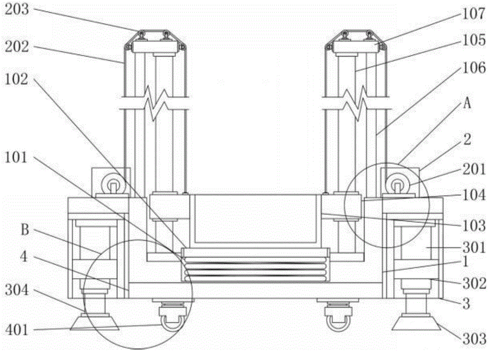 Referring to fig. 1-4, an embodiment of the present invention is shown: a liftable bracket for building engineering construction comprises a mounting frame 1, a rotating motor 2, a fixed lifting box 3 and a base 4, wherein the mounting frame 1 is fixedly installed at the top of the base 4, a movable universal wheel 401 is movably installed at the bottom of the base 4, a buffer plate 102 is fixedly installed at the top of the mounting frame 1, a placing box 103 is installed at the top of the buffer plate 102 in a butt joint mode, limiting sliding sleeves 104 are fixedly installed at two sides of the placing box 103, a limiting sliding rod 105 is sleeved inside the limiting sliding sleeve 104, the bottom of the limiting sliding rod 105 is fixedly installed with the top of the mounting frame 1, the tail ends of the limiting sliding rods 105 are connected with and installed with installation limiting plates 107, the fixed lifting box 3 is fixedly installed at two sides of the mounting frame 1, a hydraulic lifting machine 301 is fixedly installed inside the fixed lifting box 3, a lifting rod 304 is sleeved at the tail end of the hydraulic lifting machine 301, and a supporting bottom plate 303 is installed at the tail end of the lifting rod 304 in a butt joint mode, the top of the fixed lifting box 3 is fixedly provided with a rotating motor 2, the interior of the rotating motor 2 is connected with a reel 201, the input end of the reel 201 is communicated with a lifting rope 202, and the output end of the lifting rope 202 is connected with the placing box 103;