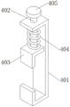 the sliding frame 401 is a C-shaped frame body with a forward opening, a support rod 402 vertically penetrates through the top of the frame body, an L-shaped movable clamp 403 is fixed at the bottom end of the support rod 402, the bottom side of the movable clamp 403 is clamped with the top side of the angle ruler 103, the support rod 402 is vertically arranged at the top of the movable clamp 403, the support rod 402 vertically penetrates through the sliding frame 401, the support rod 402 is in clearance fit with the sliding frame 401, the top end of the support rod 402 penetrates through the sliding frame 401 and is fixed with a stop block 405, and a spring 404 is sleeved on the outer side of the support rod 402 between the top side of the movable clamp 403 and the sliding frame 401;