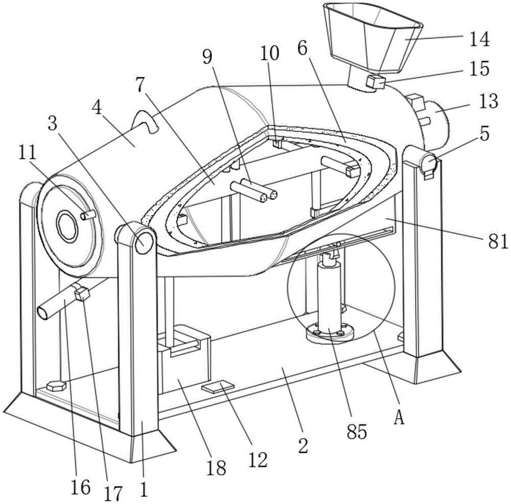 本实用新型提供的一种安全型化工生产车间负压干燥设备的工作原理如下:人员通过输料槽14将原料输送到内筒6的内部,由于内筒6是两边高中间低的设计,这时原料向内筒6的中心处输送,随后人员通过控制开关组12 调控,第一电磁阀15断电对输料槽14关闭,真空抽气泵18工作,真空抽气泵18将内筒6内部的空气抽出,使内筒6的内部处于负压状态,然后人员将右侧的连接管11与外部加热设备连接,左侧的连接管11与外部换流设备相连,外部加热设备通过右侧的连接管11将热量输送到防护筒4和内筒6之间,此时内筒6筒壁的温度升高,这时人员通过控制开关组12调控第一电磁阀15 工作,第一电磁阀15的阀门关闭,这时人员通过控制开关组12调控电机13 工作,电机13的输出轴带动柱体7转动,柱体7带动搅拌柱9转动并对内筒 6内部的原料进行搅拌,使原料能够被均匀的加热干燥,搅拌柱9带动刮板 10转动,对堆积在内筒6底端的原料卷起,提高原料的干燥效率,当干燥完成后,人员通过控制开关组12调控电机13停止工作,然后通过控制开关组 12调控电动推杆85工作,电动推杆85的伸缩端向上侧移动并带动连接头84 向上侧移动,连接头84带动滑动柱83在滑道口82的内部既转动又滑动,这时防护筒4以转轴3为支撑开始逆时针转动,当滑动柱83与滑道口82的内部右端接触时,通过控制开关组12调控电动推杆85停止工作,然后人员通过控制开关组12调控第二电磁阀17工作,第二电磁阀17的阀门打开,内筒 6的内部原料通过排料管16排出到外部收集设备中。The working principle of a safe chemical production workshop negative pressure drying equipment provided by the utility model is as follows: the personnel transport the raw materials to the interior of the