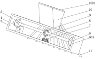 图中:1、水池;2、导向杆;3、矩形架;4、固定块;5、转轴;6、移动轮;7、电机;8、蜗杆;9、涡轮;10、料斗;11、出料管;601、橡胶垫;1101、支撑杆;1001、盖板;1002、隔板;1003、分料腔;12、出料组件;1201、圆筒;1202、圆杆;1203、进料口;1204、螺旋叶片。