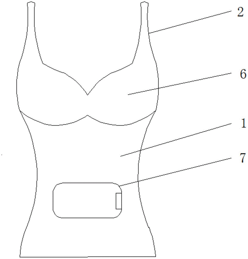 在图1中,发热块7设置在主体1前侧的底部,能够更好的为使用者的腹部保暖,保护使用者的健康,护胸6设置在主体1前侧的顶部,能够为使用者的胸部塑型,肩带2的数量有两个,能够固定束胸衣的位置,防止滑落。In FIG. 1, the