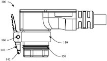 在一个实施例中,卡扣件140对应于公端接插主体110靠近信号连接孔113一侧的平面侧向外表面设置,可以充分利用空间,减小电连接器公端100的体积,同时便于用户操作。