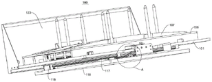 The top of transfer trolley 302 is equipped with changes elevating system 307, and coincide platform 303 is placed on changing elevating system 307, changes elevating system 307 and can adopt the commonly used scissors arm elevating system of prior art or jack type elevating system, so sets up, can make partly elevating system of coincide platform 303 realize by changing elevating system 307, can reduce coincide elevating system 305's elevating system.