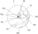底座05的内侧还固定连接有一个加固柱502,加固柱502的一侧还设有下水管501,下水管501的顶部与下水口405相连通,下水管501的另一端与底座05贯穿相连且与污水排出通道密封相连。
