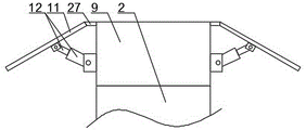 根据本实用新型的另一个实施例,如图1-4所示,所述防护模块包括设置在两个竖板2之间的门字形的安装架9、通过柔性连接片27与安装架9的前后侧端铰接的防护板11和设置在防护板11远离安装架9的一端与安装架9的侧端之间的第一伸缩推杆12,所述第一伸缩推杆12的一端与防护板11的底部铰接,所述第一伸缩推杆12的另一端与安装架9的侧端铰接。
