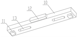 在主支撑杆5内侧竖向上通过焊接固定安装多个安装支座8,在一个实施例中安装支座8的数量为三个、四个或五个,在一个具体实施例中安装支座8的数量具体为五个,五个安装支座8竖向等间隔布置,安装支座8顶部上设置凹槽9,在相对两个安装支座8上安装横向连接杆10,在横向连接杆10两端底部对称设置两个凸起11,当横向连接杆10安装在安装支座8上时,凸起11位于凹槽9内,在一个优选实施例中,凹槽9为矩形状,凸起11为与凹槽9相适应的矩形状,凸起11的高度不大于凹槽9的深度。在另一个优选实施例中凹槽9和凸起11也可以是尺寸相适应的圆柱状或者圆台状。在横向连接杆10上通过紧固件固定安装水平尺12。在横向连接杆10顶部上还设置腰型槽13,在一个具体实施例中,腰型槽13设置两个,两个腰型槽13对称设置在横向连接杆10上,腰型槽13贯穿横向连接杆10的两端面,在横向连接杆10顶面上通过螺栓可拆卸安装定位挡块14,通过腰型槽13可调节定位挡块14的安装位置,在一个实施例中定位挡块14为L形。
