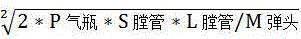 The pressure value of the compressed gas of the high-pressure gas bottle is PGas cylinder(ii) a The cross section area of the inner cavity of the hearth tube is SBore tubeThe gas thrust is F, the length of the bore tube is LBore tubeWarhead weight is M and warhead speed is VSpring speedThe gas volume of the high-pressure gas cylinder, the gas volume of the bore pipe and the gas volume of the pipeline from the electromagnetic valve to the high-pressure gas cylinder are respectively VGas cylinder;VBore tube;VPipeline from electromagnetic valve to gas cylinder. Thrust by gas: f = P × S; the gas does work: w = F × L; kinetic energy of warhead: ek = 1/2M VSpring speed 2(ii) a Energy conversion: w = Ek available: