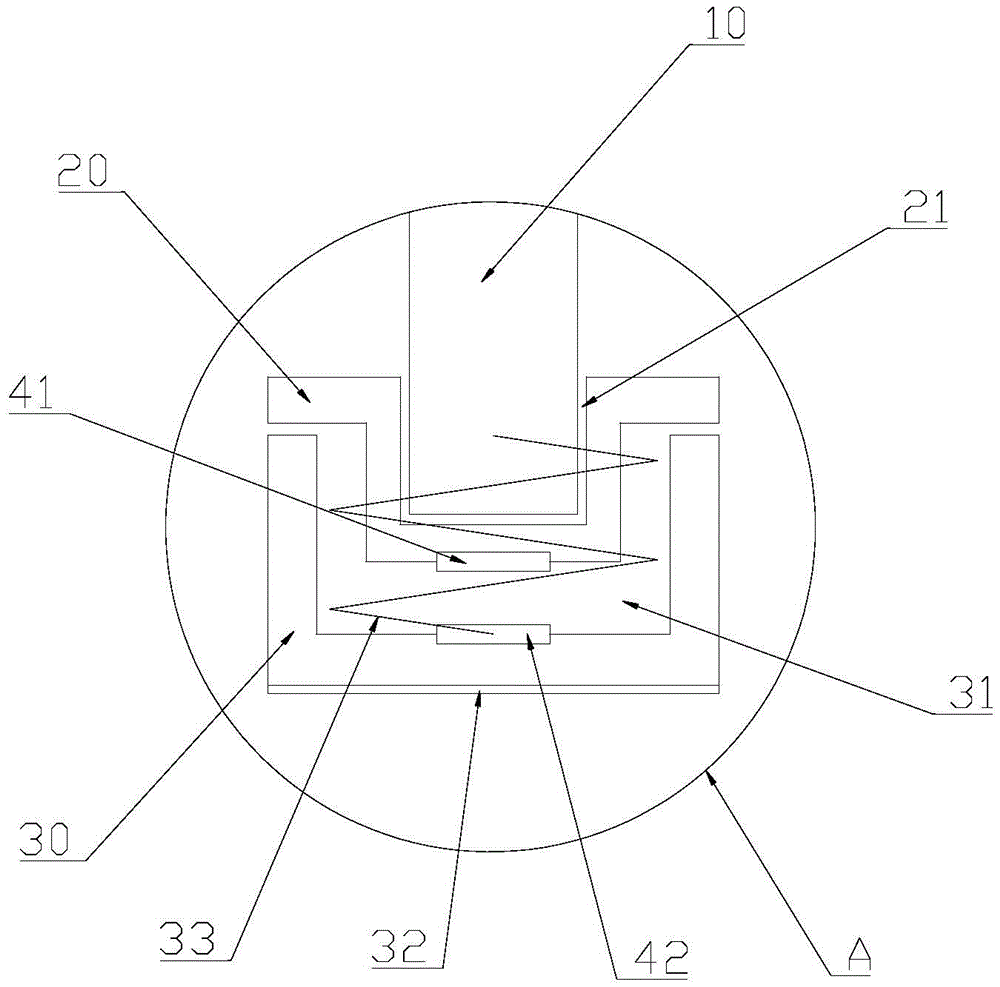 The working principle is as follows: firstly, the high-risk fall risk patient getting-off sensing device is installed on the hospital bed 10, specifically, the bed legs of the hospital bed 10 are inserted into the supporting grooves 21 and fixed. The spring 33 is set according to the coefficient of the spring 33, when no person is on the hospital bed 10, the spring 33 can support the first mounting part 20 upwards, the first contact electrode plate 41 is not in contact with the second contact electrode plate 42, and the controller controls the sound alarm 44 to be powered on to make a sound, so that medical staff and family members can be reminded to look after patients. When a patient lies on the bed, the spring 33 is compressed downward due to the increased weight of the patient, the first mounting member 20 moves downward, the first contact electrode pad 41 and the second contact electrode pad 42 are in contact, and the controller controls the audible alarm 44 not to be sounded. Alternatively, when a light patient is present in the bed 10, the master switch 43 may be pressed, i.e. the alarm function is turned off. The anti-skid rubber pad 32 can increase the friction force and ensure that the sickbed 10 is more stable.