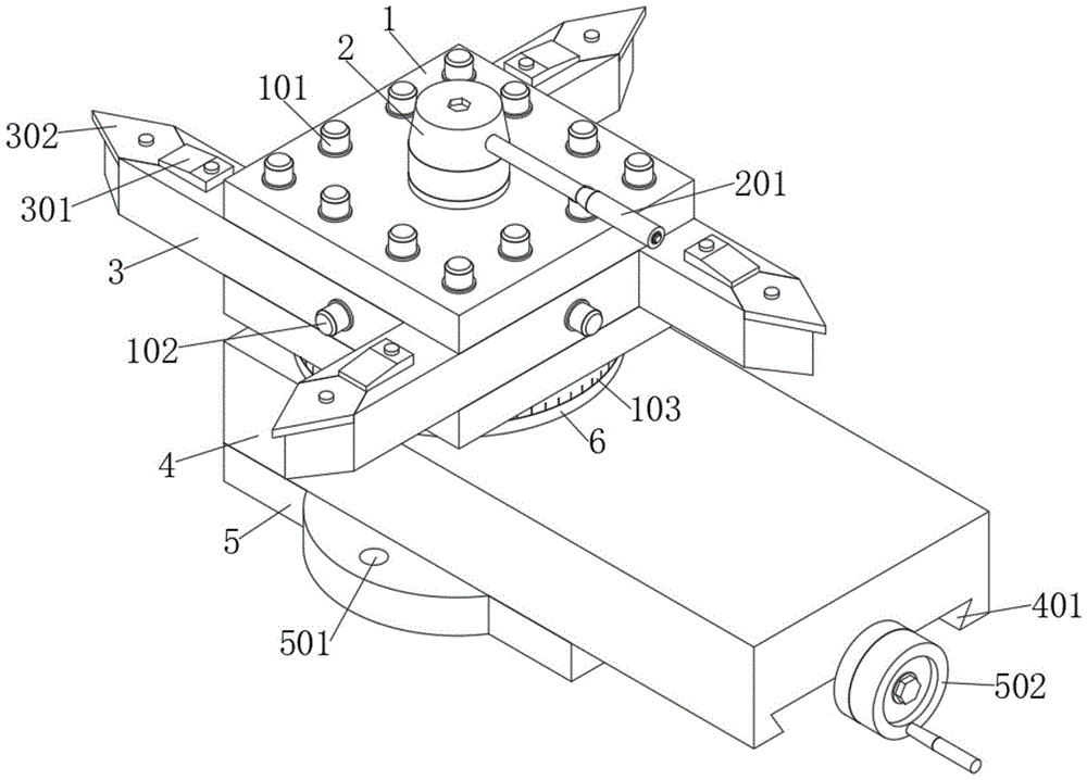 如图1-4所示,本实用新型提出的一种自动车床用刀架,包括刀座1、移动座4与底座5,底座5的顶部安装有限位滑块503,限位滑块503的内部安装有延伸出的螺旋杆504,底座5的顶部通过螺旋杆504与丝套配合安装有移动座4,移动座4的顶部安装有转盘座6,转盘座6的顶部中心安装有螺杆601,转盘座6的顶部通过螺杆601安装有刀座1,刀座1的内部通过固定螺栓101等距安装有两组刀臂3,刀座1的顶部通过螺杆601安装有紧固螺座2,且紧固螺座2的一侧安装有把杆201。As shown in Figures 1-4, a tool holder for an automatic lathe proposed by the present utility model includes a