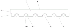 最后,相邻两个所述波瓦槽32之间的距离不小于所述管线321的外径,实际上可以在主板体31靠近中芯板1的一侧中的两个所述波瓦槽32之间的空间内进行管线321的布管,如图5所示,不过需要在填充颗粒填充之前进行这一层的管线321布管,可以增大布管量。