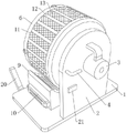 In the figure: the device comprises a base plate 1, a support plate 2, a retarding motor 3, a handle 4, a rotating shaft 5, a rotating cylinder 6, a box cover 7, a stirring rod 8, an air guide box 9, an air heater 10, an annular through groove 11, a keel rod 12, a leakage net 13, a positioning groove 14, a threaded hole 15, a positioning block 16, a bolt 17, a grasping hole 18, an air outlet hole 19, an inclined plate 20 and a control switch 21.