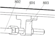 具体来说,将链条802的一端固定在增程台404的台下臂803上,另一端能够绕过移载座401与载台3的上台面连接,且将链轮801固定在移载座401 上,移载座401在沿着载台3滑动移动时,由于载台3是固定不动的。而此时移载座401带着链轮801移动,因此链条802上与载台3连接的一端固定不动,而另一端由于移载座401带动链轮801的移动的同时链条802会转动,因此该增程台404也会受到移载座401驱动链条802相对载台3移动的移动力,实现了该链条802能够带动增程台404沿着移载座401滑动运动的效果。