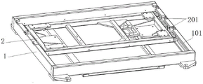具体的,上述移载组件包括移载座401,将上述第二齿条702沿基座1的第二方向设置在移载座401的座体下侧面,同时在载台3上开设让位部301,该第二齿轮701位于上述载台3和安装座2之间的空间内,且其部分齿轮适于穿过该让位部301与第二齿条702啮合连接,在第二齿轮701受到驱动力的驱动后,该第二齿轮701能够进行转动运动,进而驱动第二齿条702沿基座1的第二方向运动,实现了带动移载座401沿着上述载台3滑动运动的效果。