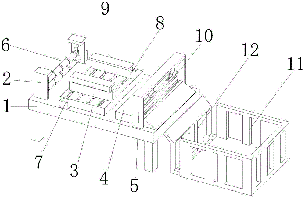 图中:1、加工台;2、第一L形固定板;3、安装板;4、切割台;5、U形固定架;6、传动组件;61、第一电机;62、第一转动棍;63、第二自动伸缩杆;64、第二转动棍;65、橡胶圈;7、距离调节组件;71、第二电机;72、螺纹杆;73、滑杆;74、第二固定板;8、第一固定板;9、第二L形固定板;10、切割组件;1001、气缸;1002、切割刀;11、收集框;12、活动架;13、第一自动伸缩杆;14、凹槽。In the figure: 1. Processing table; 2. First L-shaped fixing plate; 3. Mounting plate; 4. Cutting table; 5. U-shaped fixing frame; 6. Transmission assembly; 61. First motor; 62. First rotation stick; 63, the second automatic telescopic rod; 64, the second rotating stick; 65, the rubber ring; 7, the distance adjustment assembly; 71, the second motor; 72, the threaded rod; 73, the sliding rod; 74, the second fixing plate ; 8, the first fixing plate; 9, the second L-shaped fixing plate; 10, the cutting assembly; 1001, the cylinder; 1002, the cutting knife; 11, the collecting frame; 12, the movable frame; 13, the first automatic telescopic rod; 14 , groove.
