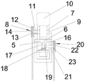 所述转台安装调节装置4包括转台安装仓16,所述转台安装仓16的内腔中通过阻尼轴承5与转台6转动连接,所述转台安装仓16的内底壁垂直转动安装有第二连接轴17,所述第二连接轴17上设有第一锥齿轮18,所述转台安装仓16的一侧设有第二调节装置20,包括设于转台安装仓16一侧的第二套杆21,所述第二套杆21外端设有第二限位保护套22,所述第二套杆21内转动设有第三连接轴23,所述第三连接轴23延伸至转台安装仓16内,并连接有第二锥齿轮19,所述第一锥齿轮18与第二锥齿轮19啮合,所述第三连接轴23的外端连接有第二调节槽轮24并位于第二限位保护套22内,所述第二调节槽轮24外侧边设有第二珠绳25,所述第二限位保护套22内壁与第二调节槽轮24外侧间距小于第二珠绳25的高度。通过牵拉第二珠绳25带动第二调节槽轮24转动,带动第三连接轴23连同第二锥齿轮19转动,第二锥齿轮19驱动第一锥齿轮18连同第二连接轴17转动,从而带动转台6连同摄像头10转动,从而调节摄像头10的水平角。The turntable