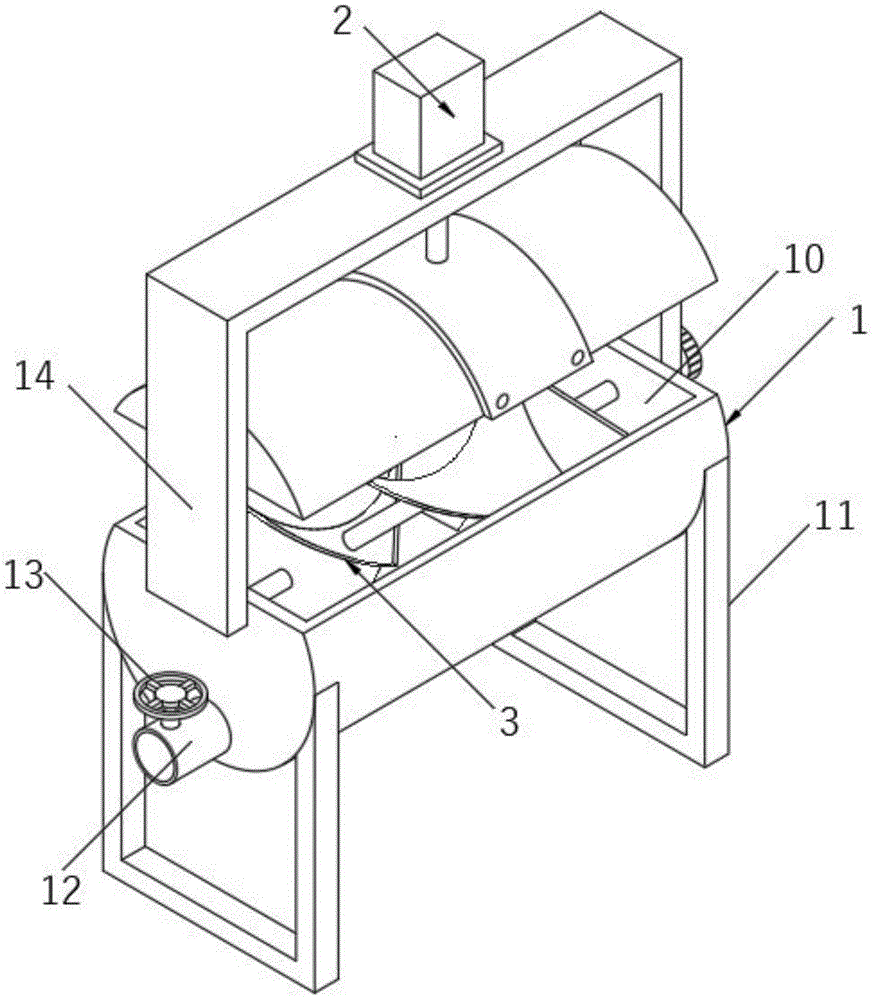 1、搅拌筒;10、暴露孔;11、支撑腿;12、出料管;13、卸料阀;14、支撑架;1. Mixing drum; 10. Exposure hole; 11. Support leg; 12. Discharge pipe; 13. Discharge valve; 14. Support frame;