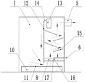 如图1结合图2所示,一种喷涂线水旋漆雾捕捉装置包括喷漆房1、水帘板12、蓄水池2、第一水泵3和第二水泵4。喷漆房1的内部被水帘板12分隔为喷漆区和漆雾过滤区。喷漆区和漆雾过滤区的底部设置有回水池10。回水池10与水帘板12之间具有连通喷漆区和漆雾过滤区的通道。喷漆房1的侧壁上设置有排气口5和输水口6。喷漆房1的顶部设置有进水口9。蓄水池2位于喷漆房1的外侧。