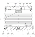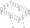 As shown in figure 1, the warning type safety lithium battery jar comprises a cover closing mechanism 1 and a laminating mechanism 3, wherein a supporting mechanism 2 used for supporting and installing is arranged at the bottom of the cover closing mechanism 1, the laminating mechanism 3 used for laminating and radiating is installed in the middle of the upper portion of the supporting mechanism 2, the vertical central line of the laminating mechanism 3 coincides with the vertical central line of the supporting mechanism 2, the cover closing mechanism 1 comprises a main battery jar 101, a wiring end 102, a cover closing cover 103, a clamping ring 104, a threading opening 105 and sealing cotton 106, the wiring end 102 is arranged in the middle of the upper end of the main battery jar 101, the cover closing cover 103 is installed above the outer portion of the main battery jar 101, the clamping ring 104 is arranged in the middle of the inner side of the cover closing cover 103, threading openings 105 are formed in the middle portions of two sides of the cover closing cover 103, the sealing cotton 106 is fixed in the middle of the threading opening 105, a display panel 5 is arranged on the upper side of the front end of the outer surface of the main battery jar 101, through the snap ring 104, the cover 103 which can be quickly covered when the main storage battery 101 is used can be pressed downwards to be snapped, so that the upper end of the main storage battery 101 can be protected, the corrosion interference of dust and moisture on the wiring terminal 102 and the like is avoided, the external wiring can be connected in a penetrating way through the threading opening 105, the external wiring can be connected through the sealing cotton 106, after the wiring body passes through, the external wiring can be quickly attached to the surface of the wiring body, so that the sealing performance of the threading opening 105 can be improved, meanwhile, the soft sealing cotton 106 is favorable for reducing the abrasion of the wiring body, meanwhile, a power supply connecting wire with a male end and a female end can be connected above the wiring terminal 102 for charging and discharging, through the display panel 5, the power supply connecting wire is provided with power display and voltage display from top to bottom, the power supply display has eight grids, and when two red grids appear, the power supply is used for warning the bottom power supply;