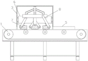 如图1和图2所示,本实用新型在此提供一种EVA地垫生产用的磨边装置包括运送机1,运送机1下端通过螺栓固定有用于支撑的支脚,运送机1后端连接有电源线2,运送机1顶端面中端通过螺栓固定有机箱3,机箱3前侧中部装配有用于便捷贯穿磨边情况的观察窗4,机箱3右侧进料口处焊接有导向板5,导向板5呈八字形,使得EVA地垫可精准进料,机箱3内部中端通过螺栓安装有驱动器6,驱动器6输出轴上安装有磨边轮7,磨边轮7位于运送机1输送带的两端,机箱3内部设有压料装置8;