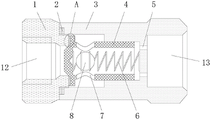 1.一种单向阀的密封结构,包括进液阀基座(1)和出液阀壳体(3),其特征在于:所述进液阀基座(1)的右侧设置有密封凸环(9),所述出液阀壳体(3)内腔的右侧固定连接有弹簧(6),所述弹簧(6)的左端设置有导流球体(8),所述弹簧(6)的另一侧固定连接有阀芯(4),所述阀芯(4)的左侧开设有凹槽(10),所述凹槽(10)的内侧固定连接有第二密封垫(11),所述出液阀壳体(3)左端的顶部和底部均开设有导液孔(7); 所述进液阀基座(1)的内表面设置有进液口(12),所述进液阀基座(1)的右端螺纹连接有出液阀壳体(3),所述进液阀基座(1)和出液阀壳体(3)之间设置有第一密封垫(2)。