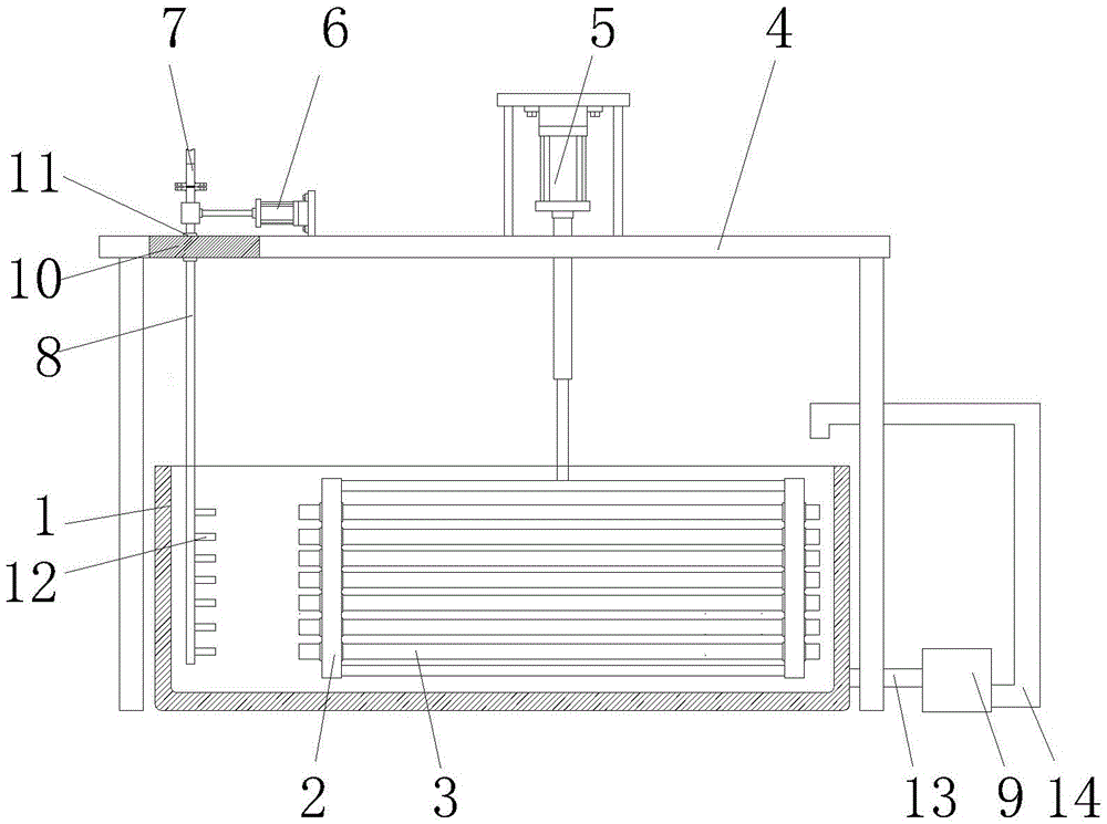 图中:1-酸洗池、2-钢管限位架、21-安装夹板、22-连接杆、23-钢管套筒、3-无缝钢管、4-安装支架、5-限位架提升气缸、6-气管驱动气缸、7-高压进气管、8-高压出气管、9-酸液过滤箱、91-箱体、92-过滤网、10-滑动槽、11-滑块、12-出气管口、13-循环出液管、14-循环进液管。In the figure: 1-pickling tank, 2-steel steel limit frame, 21-installation splint, 22-connecting rod, 23-steel pipe sleeve, 3-seamless steel pipe, 4-installation bracket, 5-limiting frame lifting cylinder , 6-tracheal drive cylinder, 7-high-pressure intake pipe, 8-high-pressure outlet pipe, 9-acid liquid filter box, 91-cabinet, 92-filter, 10-sliding groove, 11-slider, 12-outlet pipe Port, 13-circulation liquid outlet pipe, 14-circulation liquid inlet pipe.