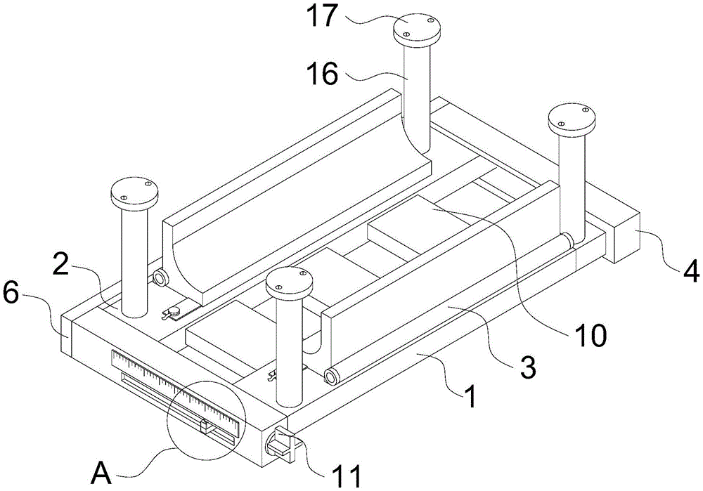 图中:1、第一底板;2、第二底板;3、压板本体;4、调节框架;5、螺纹杆;6、传动框架;7、主动轮;8、从动轮;9、皮带;10、限位板;11、十字块;12、滑动槽;13、标尺板;14、滑块;15、指针;16、支撑柱;17、连接板。In the figure: 1, the first bottom plate; 2, the second bottom plate; 3, the pressure plate body; 4, the adjustment frame; 5, the threaded rod; 6, the transmission frame; 7, the driving wheel; 8, the driven wheel; 9, the belt; 10 1. Limiting plate; 11. Cross block; 12. Sliding groove; 13. Scale plate; 14. Slider; 15. Pointer; 16. Support column; 17. Connecting plate.