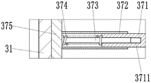 如图3所示,所述刮料机构37包括一对连接杆371、一对缓冲组件和一刮板375,一对连接杆371分别与对应的第二套筒35的外端面固接,一对缓冲组件分别活动设置在对应的连接杆371的导槽3711处,所述刮板375与一对缓冲组件固接,且所述刮板375能够与所述搅拌箱31的内侧箱壁滑动配合。