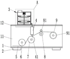 优选的,所述导向机构包括一第一导辊6、一第二导辊7、一第三导辊8、一压辊81和一收卷辊9,所述第一导辊6、所述第二导辊7、所述第三导辊8、所述压辊81和所述收卷辊9均活动安装在所述侧板11的前端面上,且所述压辊81位于所述第三导辊8的正上方,所述收卷辊9通过所述侧板11后端的第二电机91控制驱动。