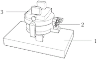 1、水平旋转组件;2、竖直调角组件;3、夹持组件;11、底架;12、驱动架板;13、第一驱动装置;14、蜗杆;15、支撑块;16、蜗轮;17、转动柱;21、底板;22、支撑柱;23、圆台;24、调角架;25、调节组件;251、第二驱动装置;252、螺纹杆;253、螺纹架;254、限位圆盘。