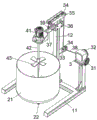 附图标记中:11、U型框;12、立杆;13、弧形挡板;21、配料桶;22、移动轮;3、外壳;31、转轮;311、主动锥齿轮;32、收线轮;321、从动锥齿轮;33、固定座;34、输送轮;35、顶座;36、移动座;37、连接柱;38、钢丝绳;39、挂钩;41、搅拌电机;42、搅拌轴;43、搅拌叶。