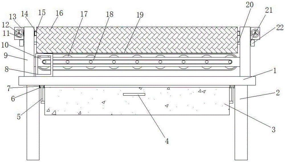 工作原理:本实用新型在使用时,首先,打开驱动电机8,通过传动轴和传动皮带18驱动辊轴17进行转动,这时外部的传送带19可进行活动,当物料在传送时,可旋拧双向螺杆12,这时外部套接的两个挡料板16会向中间相向运动,从而将物料的两端进行阻挡防止物料从侧边漏出,使得物料在传送的过程中更加顺利,之后,因连接杆20嵌在第三滑槽21的内部,利用第三固定块22,可将连接杆20在第三滑槽21的内部进行移动,在移动的过程中,连接板23底部的毛刷24可对传送带19台面的废石进行清扫,再将挡料板16进行翻转,废石可掉入收集盒3的内部,使得传送带19可便于及时清理,最后,因连接块7嵌在第一滑槽6的内部,可利用把手4将收集盒3抽拉至外部,在顶部清扫时的,废屑会掉入收集盒3中,这样使得废屑可便于进行统一收集处理,使用完毕后,再将收集盒3移动至原处即可。Working principle: when the utility model is in use, firstly, turn on the
