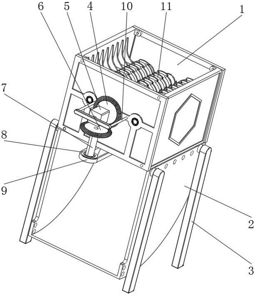 1、防护罩;2、出料壳;3、支撑脚;4、第一锥形齿轮;5、电机;6、第二锥形齿轮;7、连接轴;8、第一传动轮;9、传动带;10、连接架;11、第一碎料棒;12、第二碎料棒;13、第一齿轮;14、第二齿轮;15、第三齿轮;16、第四齿轮;17、转动门;18、固定板;19、第二传动轮;20、搅拌扇叶;21、转动架。1. Protective cover; 2. Discharge shell; 3. Support foot; 4. First bevel gear; 5. Motor; 6. Second bevel gear; 7. Connecting shaft; 8. First transmission wheel; 9. Transmission belt; 10, connecting frame; 11, the first scrap bar; 12, the second scrap bar; 13, the first gear; 14, the second gear; 15, the third gear; 16, the fourth gear; 17, rotation Door; 18, fixed plate; 19, second drive wheel; 20, stirring blade; 21, turret.
