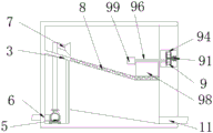 The water pump 5 draws out the sewage in the sewage treatment box 3 and spouts from the spray pipe 7, and sewage filters out through impurity filter screen 8 back impurity, and impurity removes the rightmost side to impurity filter screen 8, and impurity clearing device 9 starts to scrape impurity into blow off pipe 10 from impurity filter screen 8, and the liquid of filtering is discharged from drain pipe 11.