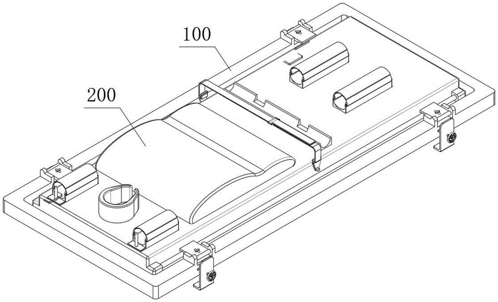 请参考图1至图5,本实用新型实施例提供了一种可调式俯卧位固定装置,包括与病床连接成一体的支撑单元100和安装在支撑单元100内部的用于对俯卧位使用者进行支撑固定的固定单元200,固定单元200活动安装在支撑单元100内部。Please refer to Fig. 1 to Fig. 5, the embodiment of the present utility model provides an adjustable prone position fixation device, including a