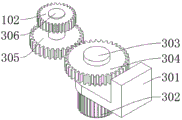 in this embodiment: the power device 3 comprises a support 301, a motor 302 is installed at the bottom of the support 301, a first rotating shaft 303 is arranged at the top of the motor 302, a second gear 304 is arranged at the top end of the first rotating shaft 303, a third gear 305 is arranged on one side of the second gear 304, a second rotating shaft 306 is arranged in the middle of the third gear 305, the support 301 is made of Q235 steel, the second rotating shaft 306 is in bearing connection with the fixed frame 101, the first gear 102 is in bolt connection with the second rotating shaft 306, the support 301 supports the motor 302 to drive the second gear 304 to rotate through the first rotating shaft 303, the second gear 304 is meshed with the third gear 305 to rotate, and the third gear 305 drives the first gear 102 to rotate through the second rotating shaft 306.