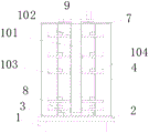 请参阅图1至图4,本实用新型提供一种技术方案:一种景观环境设计小样存放装置,包括支架1,支架1顶端固定安装底座2,底座2顶面固定安装底板3,底板3外围固定安装有若干个玻璃板5,相邻的两个玻璃板5之间设置有防护板4,若干个防护板4均通过螺钉固定安装在盖板7的底部,其中两个防护板4之间通过转轴106转动安装有门板105,转轴106固定安装在底板3与盖板7之间,底板3顶面安装有存放架10;Please refer to Fig. 1 to Fig. 4, the utility model provides a kind of technical scheme: a kind of landscape environment design small sample storage device, comprises