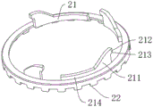 具体的,定位件2为环形的定位圈结构,卡勾结构21的连接部211设置于定位圈的内圈壁,所述连接部211的梯形板状结构为了方便安装也具有一定弧度,且与锁紧孔11的弧度相同。