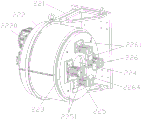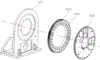 As shown in fig. 1 and 4, further, the driving turntable 222 is connected to the hollow chuck base 221 through a roller bearing, a ring side surface of the inner ring 228 of the roller bearing is fixedly connected to an inner ring side surface of the hollow chuck base 221 through a bolt, a ring side surface of the outer ring 229 of the roller bearing is fixedly connected to an outer edge of the ring side surface of the driving turntable 222 through a bolt, a circumferential surface of the outer ring 229 of the roller bearing is of a gear structure, and a reduction gear output end gear of the turntable driving mechanism 2220 (the installation position is, for example, the lower circular through hole position in fig. 4) is engaged with a gear on the circumferential surface of the outer ring 229 of the roller bearing to drive the driving turntable 222 to rotate; the driven rotary table 223 is fixedly connected with the driving rotary table 222 through a connecting cylinder 224, and the driving rotary table 222 drives the driven rotary table 223 to synchronously rotate through the connecting cylinder 224.