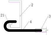 在本实用新型所述的箱式房洞口临边防护装置中,所述弯折部21为一个折边,用于与悬挂部4连接,由进行安全带与挂钩预先组装完成,通过利用箱式房原墙板位置转角位置进行挂钩连接固定,通过拉紧器5对安全带进行收紧,形成临边防护。