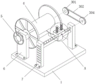 完成对铝合金废线的限位后,工作人员转动转动盘5,转动盘5带动主转轴8转动,主转轴8带动收卷滚轴4转动,收卷滚轴4带动铝合金废线卷绕于收卷滚轴4外表面,在此过程中,收卷滚轴4通过主转轴8带动主动轮301转动,主动轮301通过传动带302带动从动轮303转动,从动轮303带动往复丝杠304转动,往复丝杠304带动第二丝杠座306做往复移动,第二丝杠座306带动绷紧组件2带动铝合金废线在滑杆305横向方向往复移动。