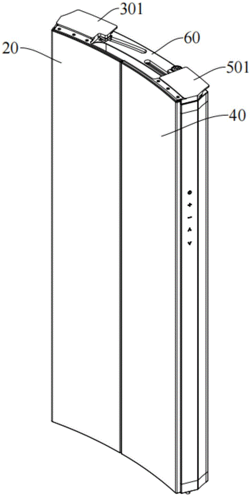 可选地,第一驱动装置包括:第一基板301、第一滑动组件和第一调节组件。本实施例的第一驱动装置通过第一基板301连接第一面板20,第一滑动组件通过驱动第一基板301带动第一面板20滑动以开启或关闭第一出风口102,通过第一调节组件调节第一面板20的倾斜角度,以避免运动过程中与第二面板40发生干涉。Optionally, the first driving device includes: a