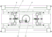 伸缩臂6下方还安装有从中间板7中部通槽穿出的吊具组件,吊具组件与重卡汽车电池包上的对接框对接后,通过提升组件3进行转运。吊具组件包括矩形横板13、铰接在矩形横板13底部的若干吊钩以及驱动吊钩旋转的驱动装置,吊钩的数量优选为四个,分别位于横板13底部的四角处。吊钩的钩体位于横板13的下方,吊钩的驱动连接件连接至驱动装置上,驱动装置能够根据需要驱动吊钩旋转,使得吊钩的钩体位于横板13的内侧,与电池对接框不发生接触,或者驱动吊钩旋转,使得吊钩的钩体相对于横板13向外转出,勾住电池对接框的框架,实现吊具组件与电池对接框的吊装固定。吊具组件通过铁链18与中间板7连接,导向柱9固定安装在吊具组件横板13的四角处,对重卡汽车电池包进行导向。