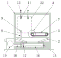图中:1-安装箱;2-下料斗;3-电机;4-主动轮;5-从动轮;6-传动带;7-磨砂带;8-支撑杆;9-第一安装块;10-电动伸缩杆;11-压块;12-第二安装块;13-调节杆;14-刻度杆;15-收集盒;16-磁石板;17-过滤网;18-安装管;19-抽风机;20-拉环;21-门板;22-钣金件本体。
